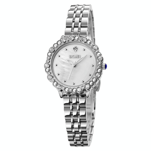 SKMEI 1799 Pearl Diamond Round Dial Stainless Steel Strap Quartz Watch for Ladies(Silver and White Surface)