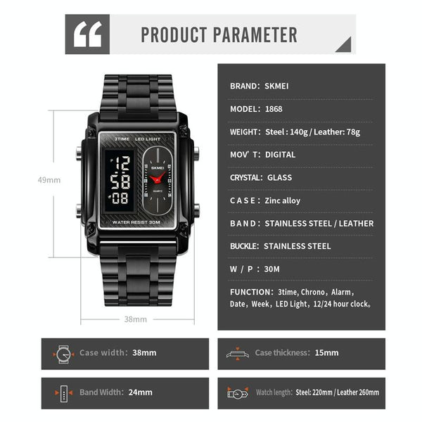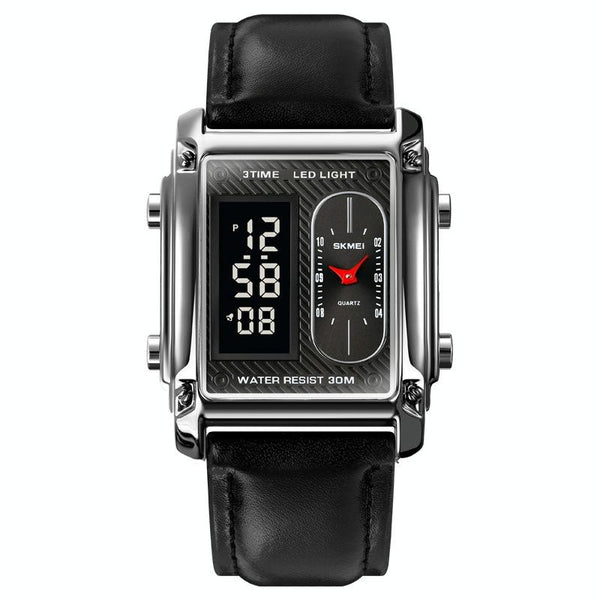 SKMEI 1868 Square Double Display Waterproof Men Watch, Style: Leather Belt (Silver)