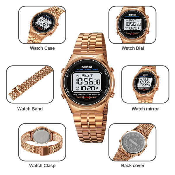 5. Functions: time, stopwatch, date, alarm clock, EL luminous light, hourly time chime, 12/24 hour format, countdown