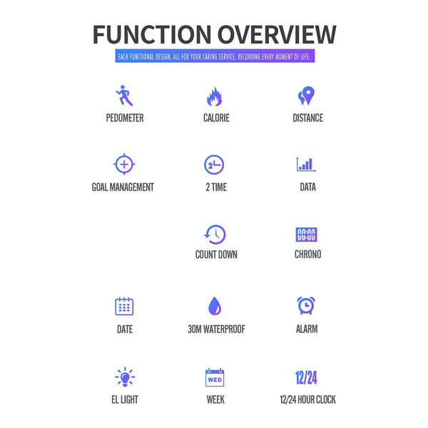 5. Functions: time, date, alarm clock, hourly time, 12/24 hour format, exercise step counting, exercise mileage, calorie calculation, running seconds