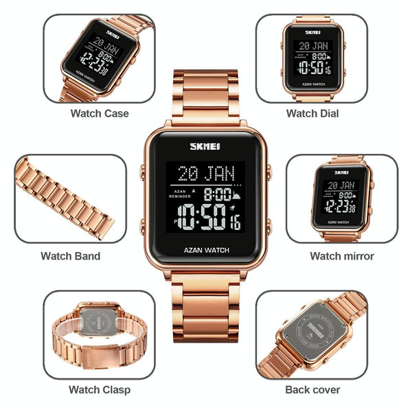 5. Functions: prayer time reminder, prayer name display, qibla direction indication, Gregorian calendar, Hijri calendar, city data, daylight saving time function, bookmark function, language selection, volume adjustment, battery display time, stopwatch timing, night light, date, scheduled alarm , day of the week, 12/24 hour format