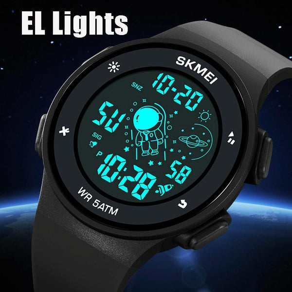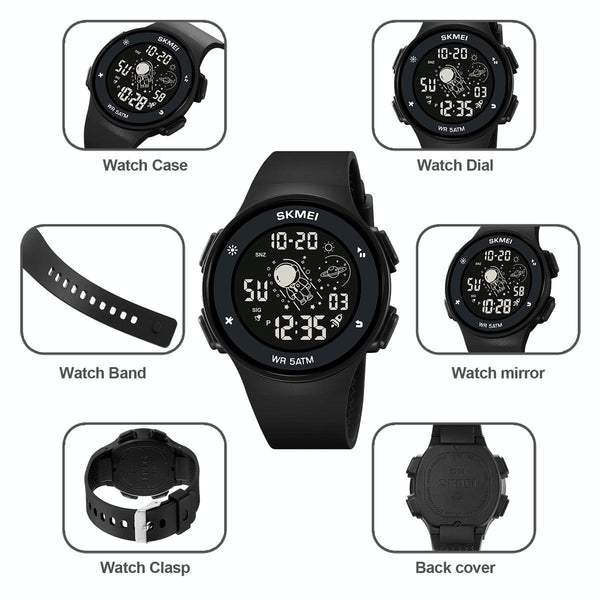 5. Functions: dual time, date, stopwatch, EL luminous, alarm clock, hourly time chime, 12/24 hour format, countdown