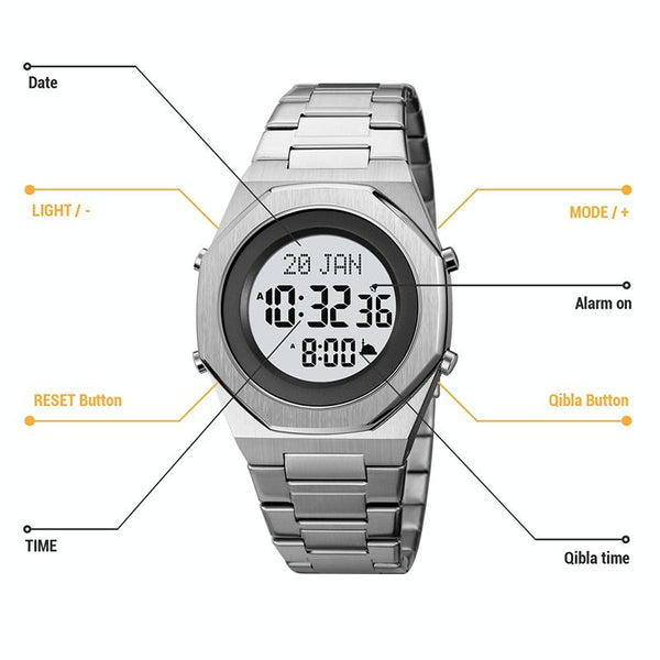 5. Functions: prayer time reminder, prayer name display, qibla direction indication, Gregorian calendar, Hijri calendar, city data, daylight saving time function, bookmark function, language selection, volume adjustment, battery display time, stopwatch timing, night light, date, scheduled alarm , day of the week, 12/24 hour format