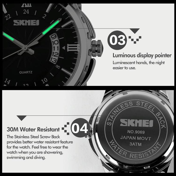 SKMEI 9069 Multifunctional Outdoor Fashion Business Waterproof Interval Gold Shell Quartz Wrist Watch(Rose Gold)