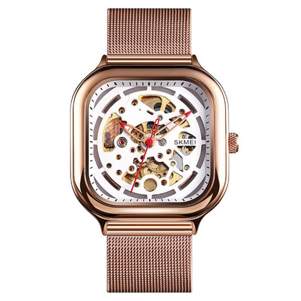 SKMEI 9184 Men Automatic Mechanical Watch Mesh with Hollow Square Tourbillon Student Watch (Rose Gold)