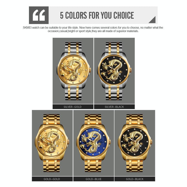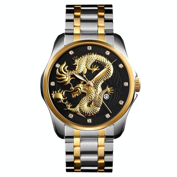 SKMEI 9193 Men Golden Dragon Pattern Calendar Dial Luminous Quartz Watch(Silver Black)