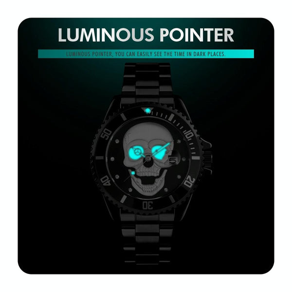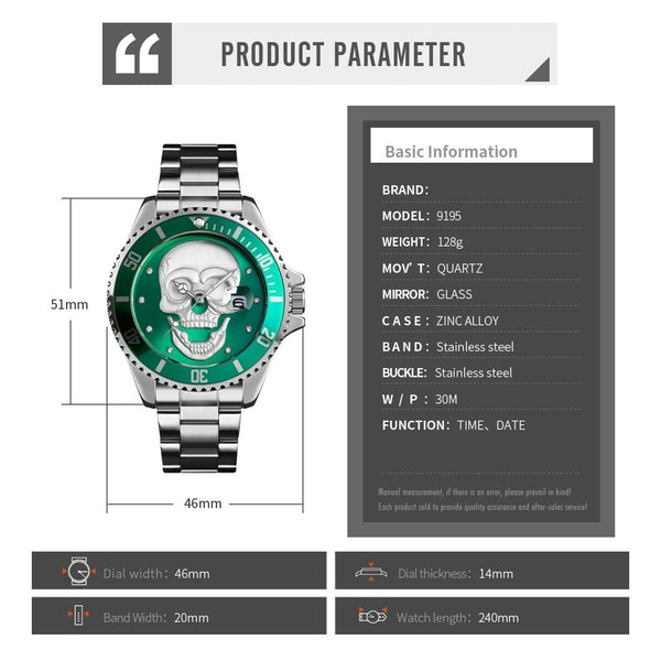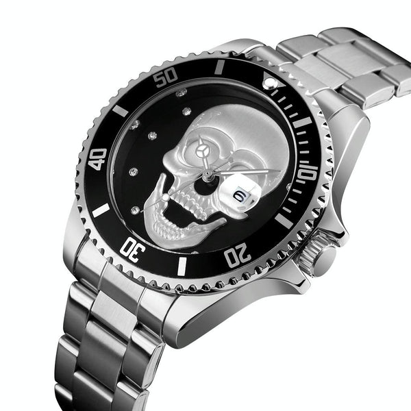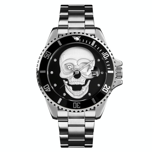 SKMEI 9195 Fashion Water-inlaid Drill Skull Nightlight Waterproof Quartz Watch Steel Strip Watch for Men(Silver Black)