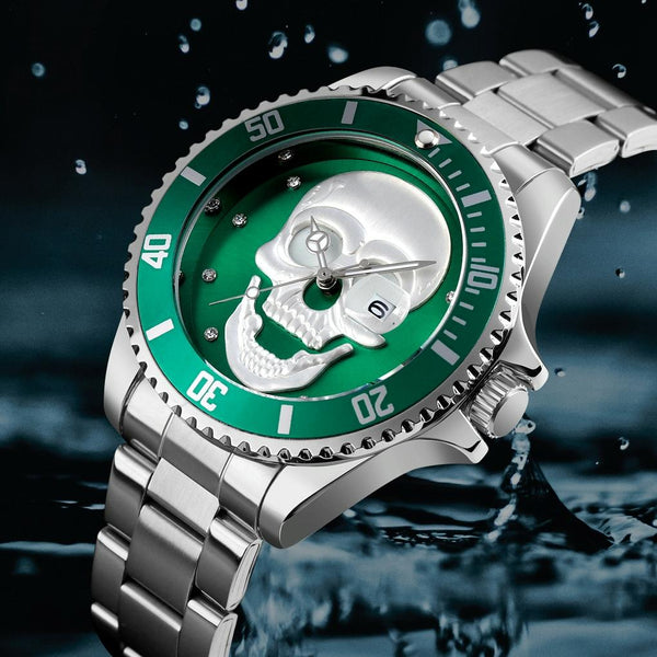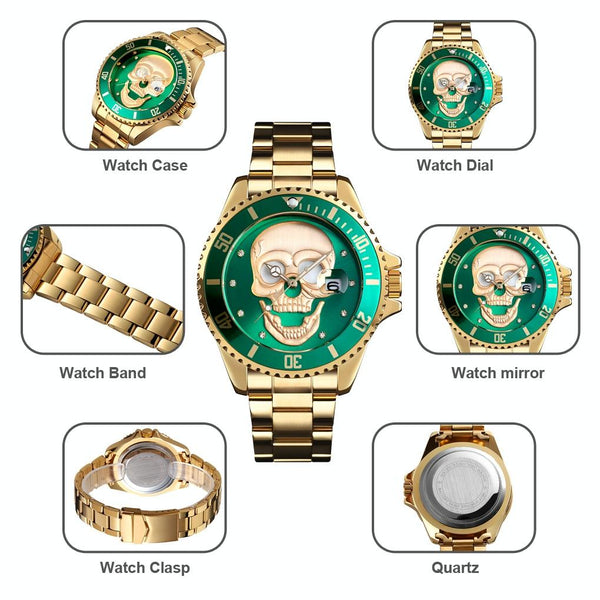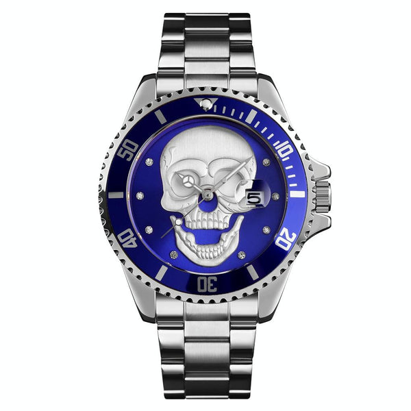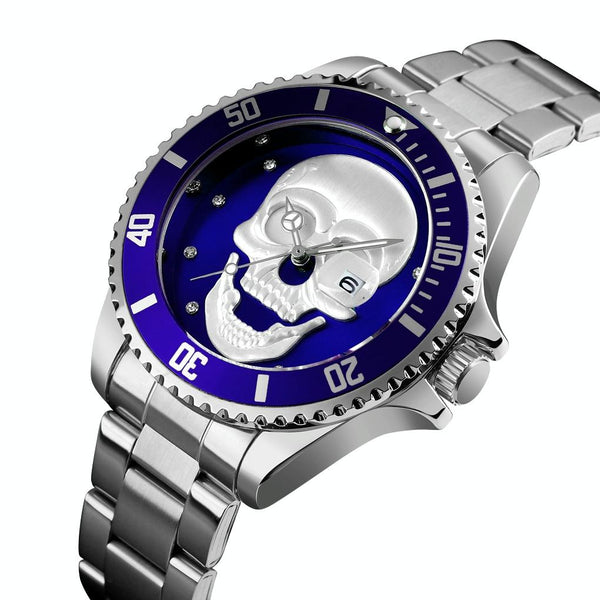 SKMEI 9195 Fashion Water-inlaid Drill Skull Nightlight Waterproof Quartz Watch Steel Strip Watch for Men(Silver Blue)
