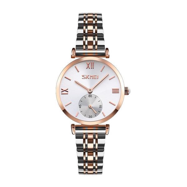 SKMEI 9198 Simple Roman Numeral Dial Metal Belt Quartz Watch for Couples(Rose Gold Silver Women)