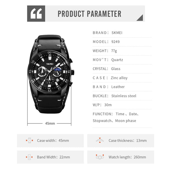 SKMEI 9249 Men Moonphase Calendar Stopwatch Leather Strap Quartz Watch(Black)