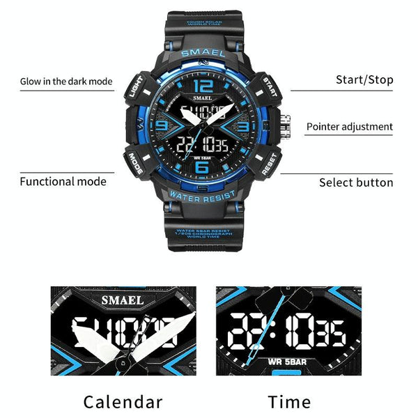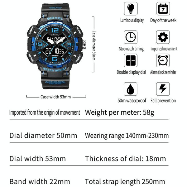 1. Function: dual display dial, stopwatch timing, LED luminous, date display, timer alarm, week display, shockproof and drop resistant