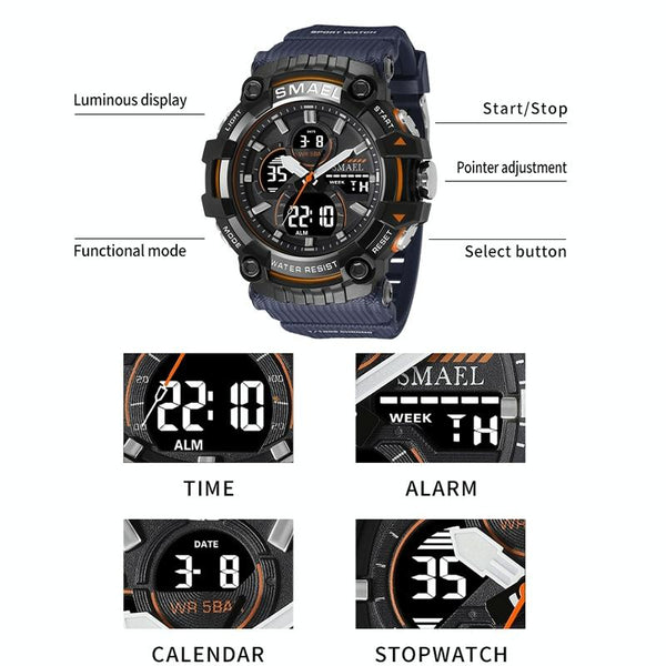 1. Function: dual display dial, luminous, chronograph stopwatch, day, calendar, shockproof and drop resistant