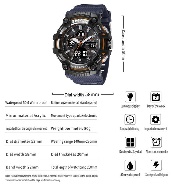 1. Function: dual display dial, luminous, chronograph stopwatch, day, calendar, shockproof and drop resistant