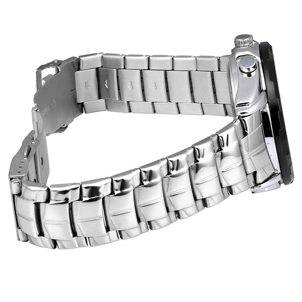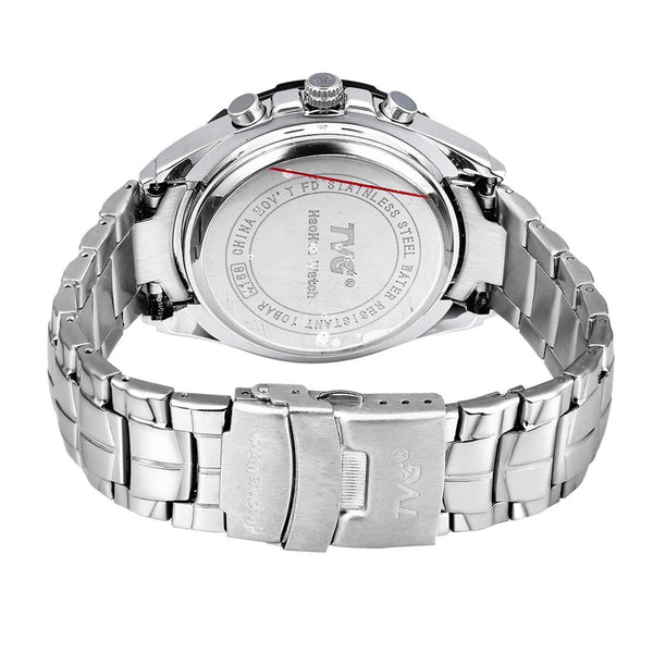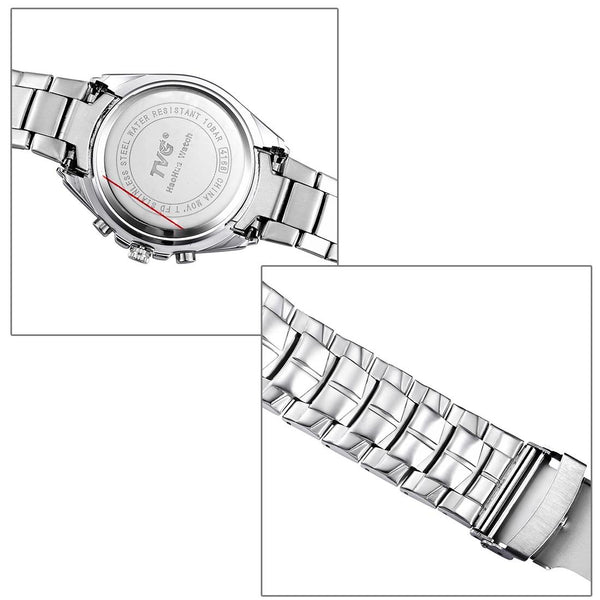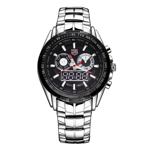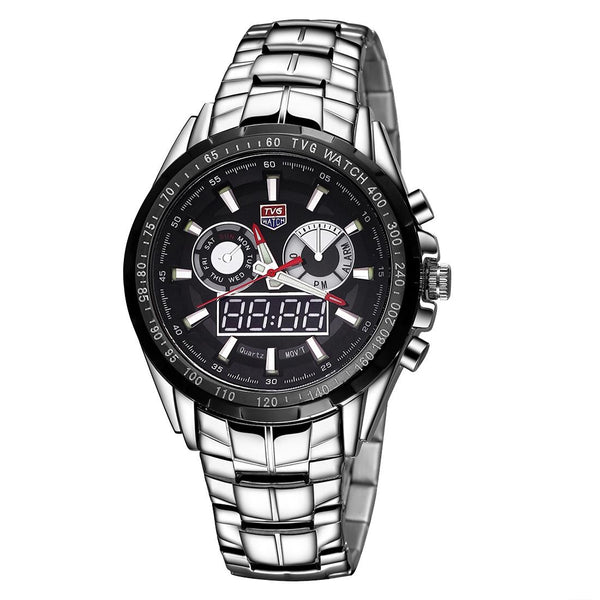TVG Round Dial Glass Watch Window Luminous & Alarm & Week Display Function Quartz + Digital Double Movement Men Watch with Alloy Band(Black)