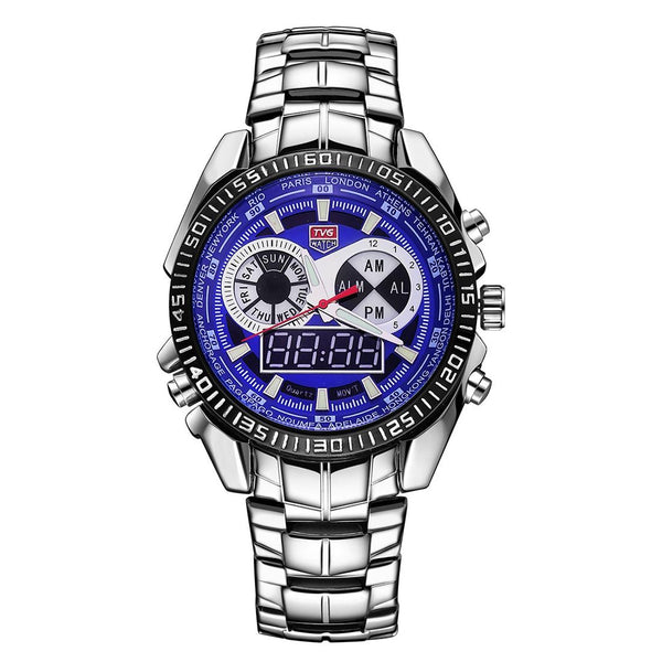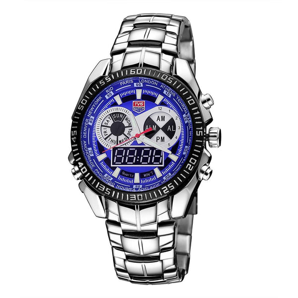 TVG Round Dial Hardlex Watch Window Luminous & Alarm & Week Display Function Quartz + Digital Double Movement Men Watch with Alloy Band(Dark Blue)
