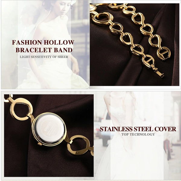 1. The watch features with gold-toned watch case with simple display design and unique round-hollowed bracelet. Perfect for all kind of business, casual, indoor activities and daily use.