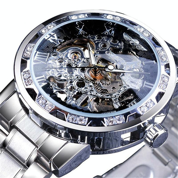 Winner Leisure Skeleton Diamond Luminous Pointer Watch Men Manual Mechanical Watch(Silver Belt Silver Shell Black Face)