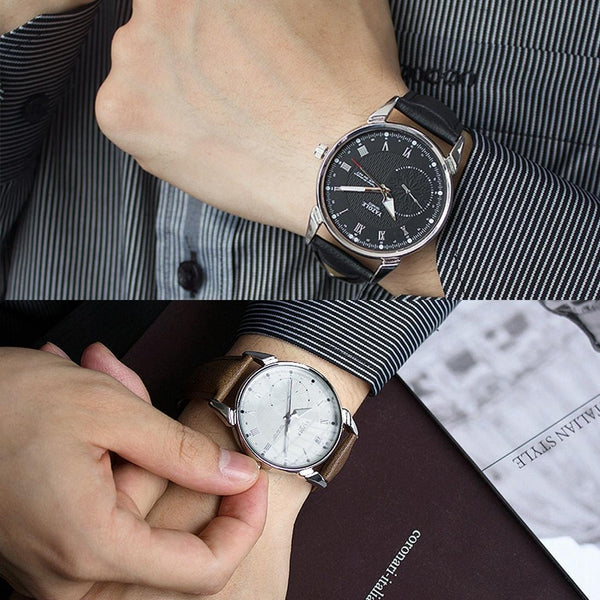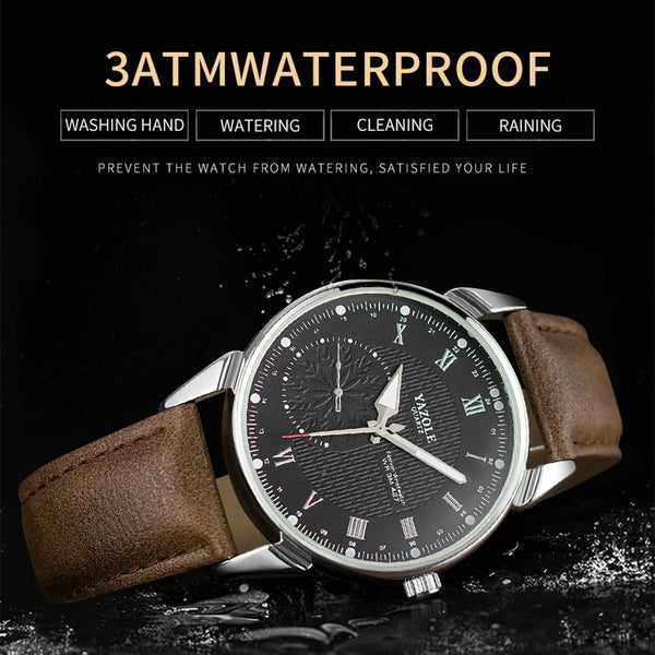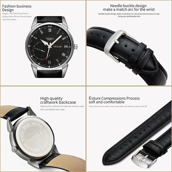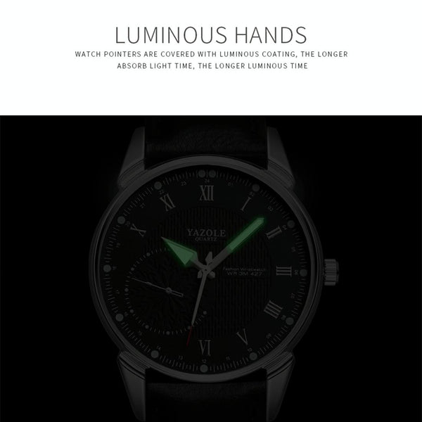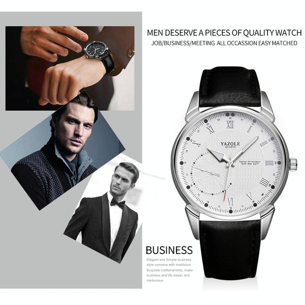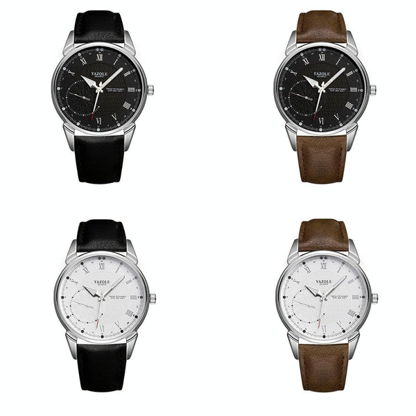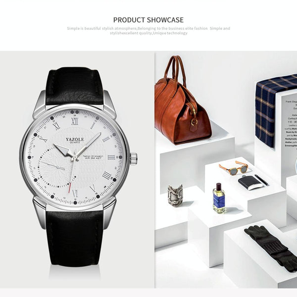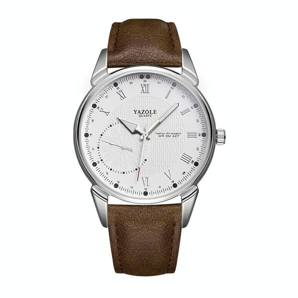 YAZOLE 427 Men Fashion Business PU Leather Band Quartz Wrist Watch, Luminous Points (White Dial + Brown Strap)