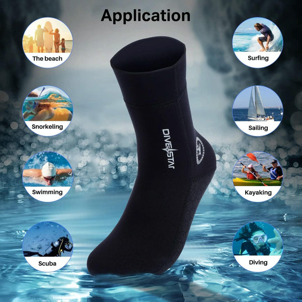 1. High-top diving socks are available in two thicknesses: 3mm/5mm. They are made of elastic nylon cloth and are durable and wear-resistant.