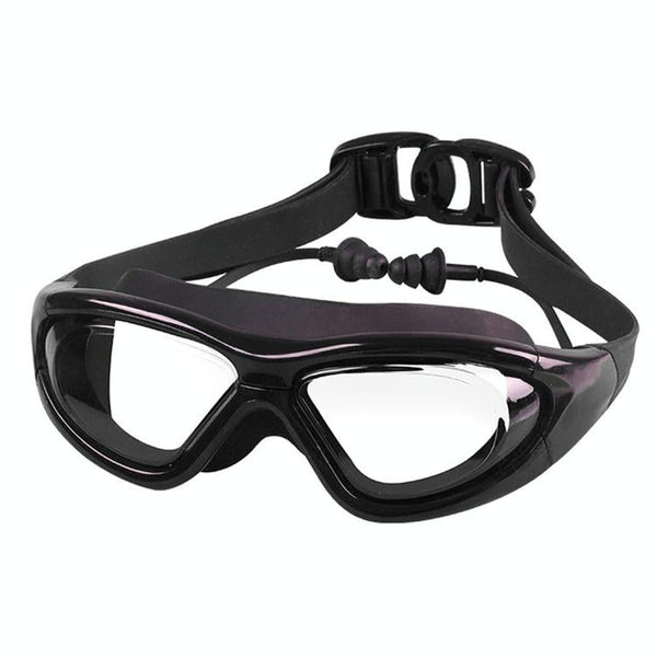 J8150 Eye Protection Flat Light Adult waterproof Anti-fog Big Frame Swimming Goggles with Earplugs(Transparent Black)