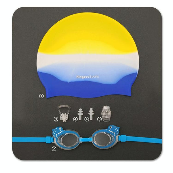 KingpouSports K9002 5 in 1 Children Anti-fog Diving Swimming Goggles + Swimming Cap + Nose Clip + Earplugs + Mirror Buckle Set(Blue Fish)