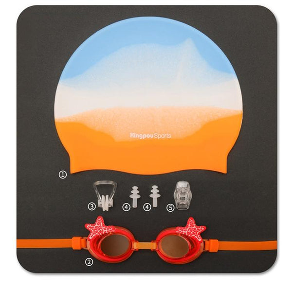 KingpouSports K9002 5 in 1 Children Anti-fog Diving Swimming Goggles + Swimming Cap + Nose Clip + Earplugs + Mirror Buckle Set(Orange Starfish)