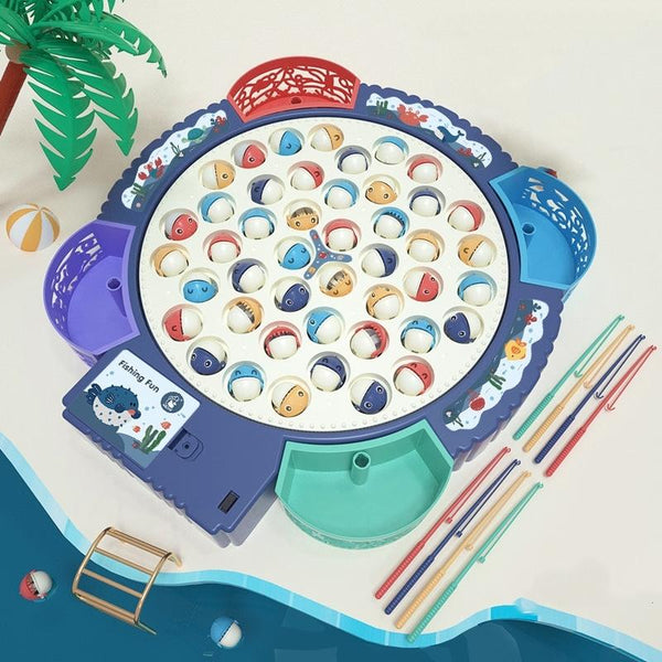 Magnetic Fishing Toy Children Educational Multifunctional Music Rotating Fishing Plate, Colour: Blue Battery Style+45 Fish 4 Rods+Education Content