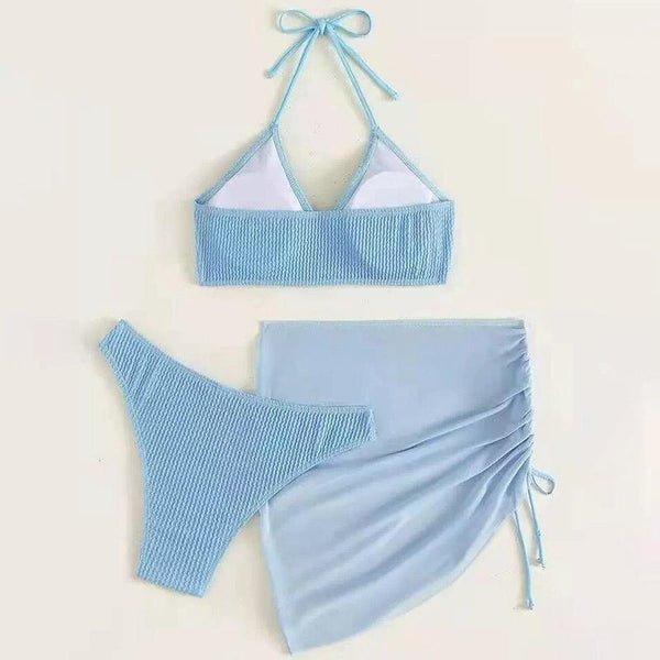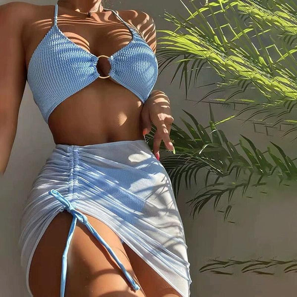 3 in 1 Set Sexy Backless Bikini Ladies Split Swimsuit with Short Skirt, Size:XL(Blue)
