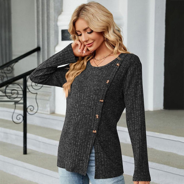 Autumn And Winter Round Neck Button Split Loose Long-Sleeved T-Shirt Top, Size: L(Black)
