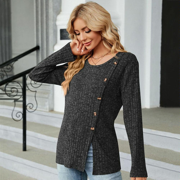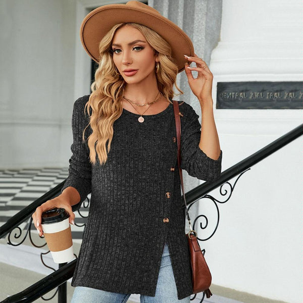Autumn And Winter Round Neck Button Split Loose Long-Sleeved T-Shirt Top, Size: S(Black)