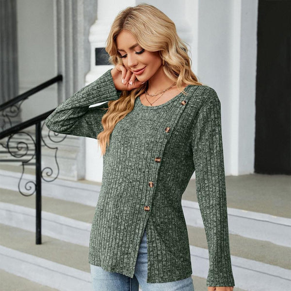 Autumn And Winter Round Neck Button Split Loose Long-Sleeved T-Shirt Top, Size: XXL(Green)