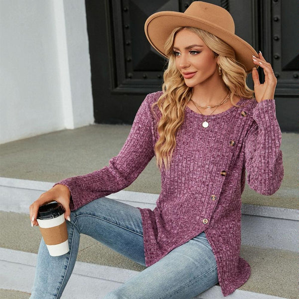 Autumn And Winter Round Neck Button Split Loose Long-Sleeved T-Shirt Top, Size: XXL(Purple Red)
