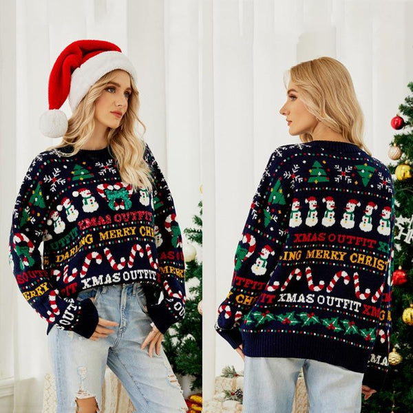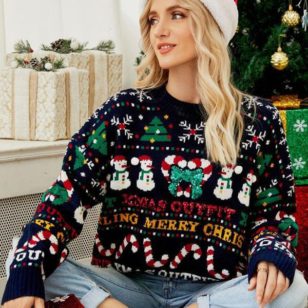 Autumn And Winter Women Loose Knit Sweater Christmas Tree Crew Neck Sweater, Size: XL(Dark Blue)