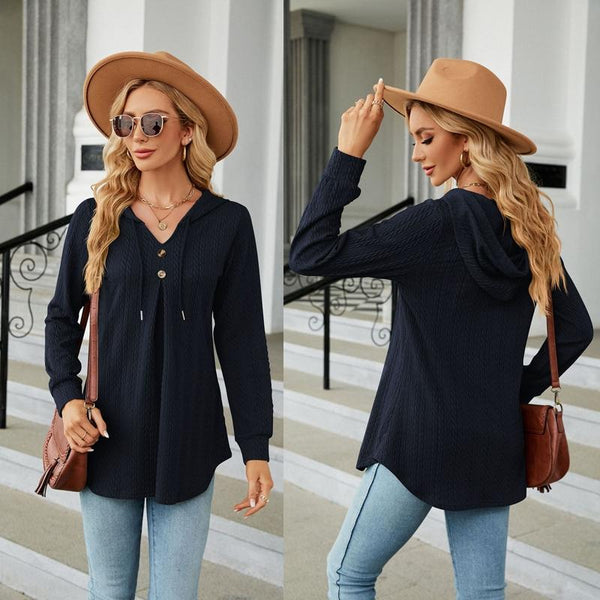 Autumn Winter V-Neck Loose Long Sleeve Hooded Sweatshirt Women Outerwear, Size: L(Navy)