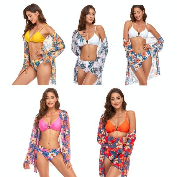 Bikini + Mesh Shawl + Split Swimsuit Women Swimsuit With Chest Pad, Size: S(Yellow)