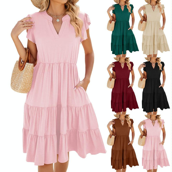 2. UNIQUE - Featuring charming ruffled short sleeves, V-neck, loose fit, pleated skirt, solid and floral layered bohemian midi dress, this summer dress is perfect for bold and stylish women who want to make a statement.