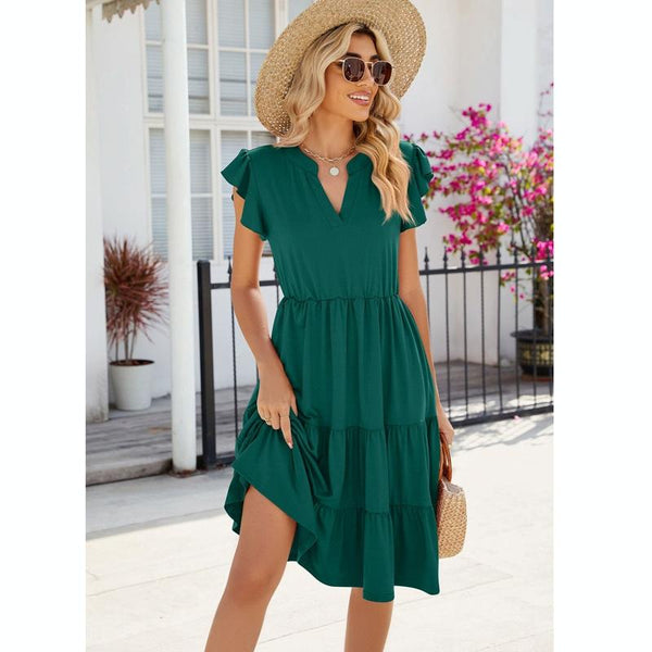 Butterfly Sleeve Layered Hem Dress V-Neck Loose Waist-Cinching Patchwork Dress, Size: M(Dark Green)