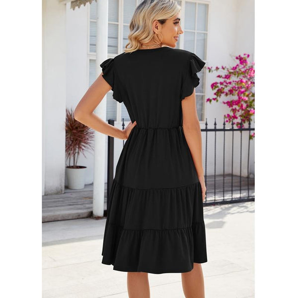 Butterfly Sleeve Layered Hem Dress V-Neck Loose Waist-Cinching Patchwork Dress, Size: XL(Black)