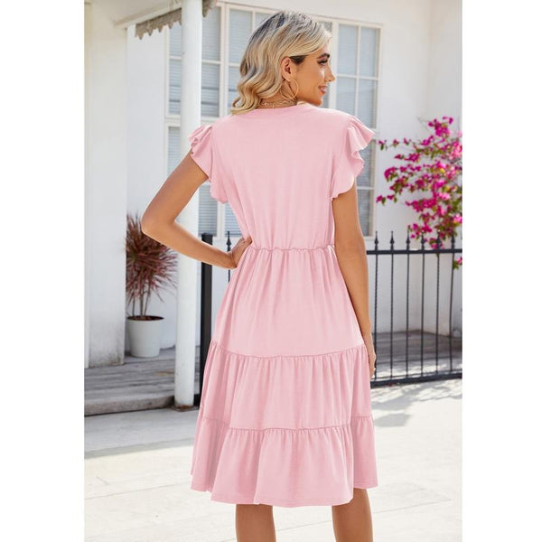 Butterfly Sleeve Layered Hem Dress V-Neck Loose Waist-Cinching Patchwork Dress, Size: XL(Pink)