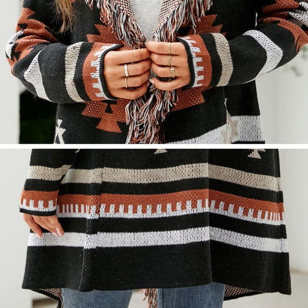 Geometric Jacquard Long Sweater Jacket Tassel Hooded Knit Cardigan, Size: M(Black)