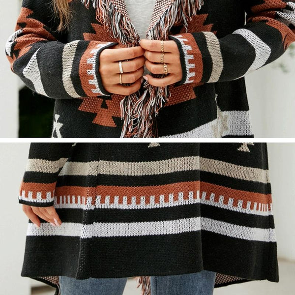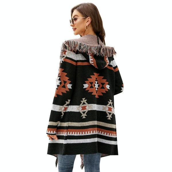 Geometric Jacquard Long Sweater Jacket Tassel Hooded Knit Cardigan, Size: S(Red)