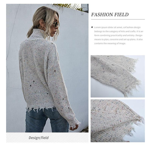 Ladies Loose Off Shoulder Ripped Long-Sleeved Turtleneck Autumn Knitted Sweater, Size:L(Beige)