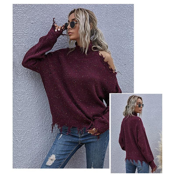 Ladies Loose Off Shoulder Ripped Long-Sleeved Turtleneck Autumn Knitted Sweater, Size:M(Wine Red)