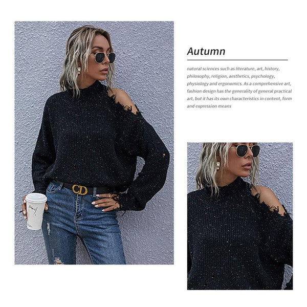 Ladies Loose Off Shoulder Ripped Long-Sleeved Turtleneck Autumn Knitted Sweater, Size:S(Black)