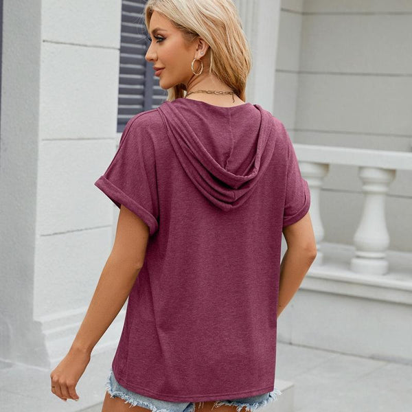 Ladies Summer Hooded Button Loose Short Sleeve T-Shirt Blouse, Size: XL(Wine Red)