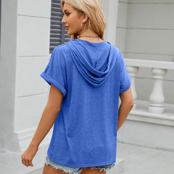 Ladies Summer Hooded Button Loose Short Sleeve T-Shirt Blouse, Size: XXL(Blue)