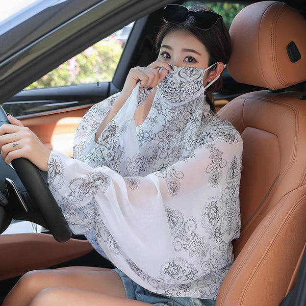 Ladies Summer Sun Shawl Riding Long Sleeve Cape Veil All-In-One Sun Protective Clothing, Style: Black And White Celadon
