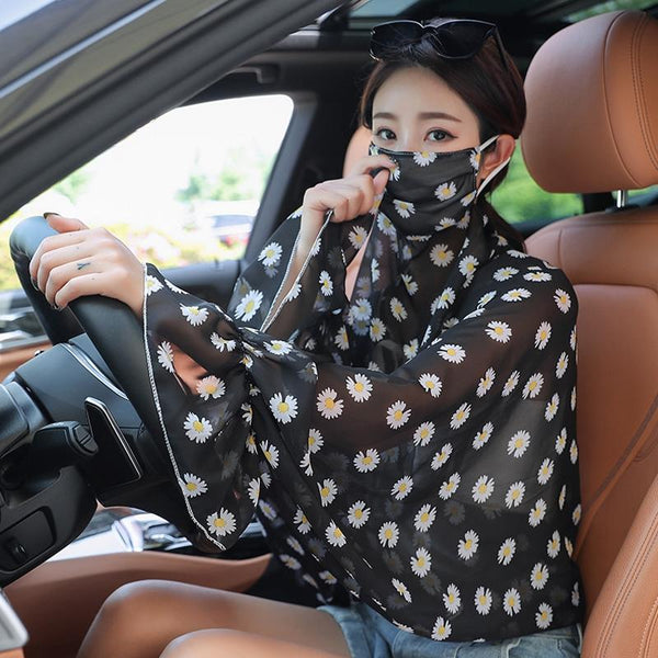 Ladies Summer Sun Shawl Riding Long Sleeve Cape Veil All-In-One Sun Protective Clothing, Style: White Gray Flowers