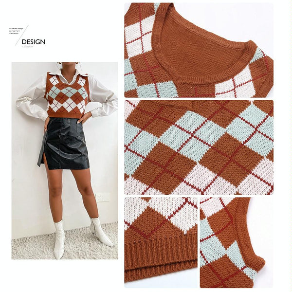 Plaid Sleeveless Ladies V Neck Knit Crop Top Sweater Vest, Size:M(Coffee)