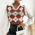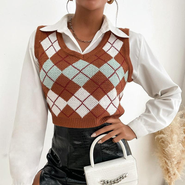 Plaid Sleeveless Ladies V Neck Knit Crop Top Sweater Vest, Size:S(Coffee)
